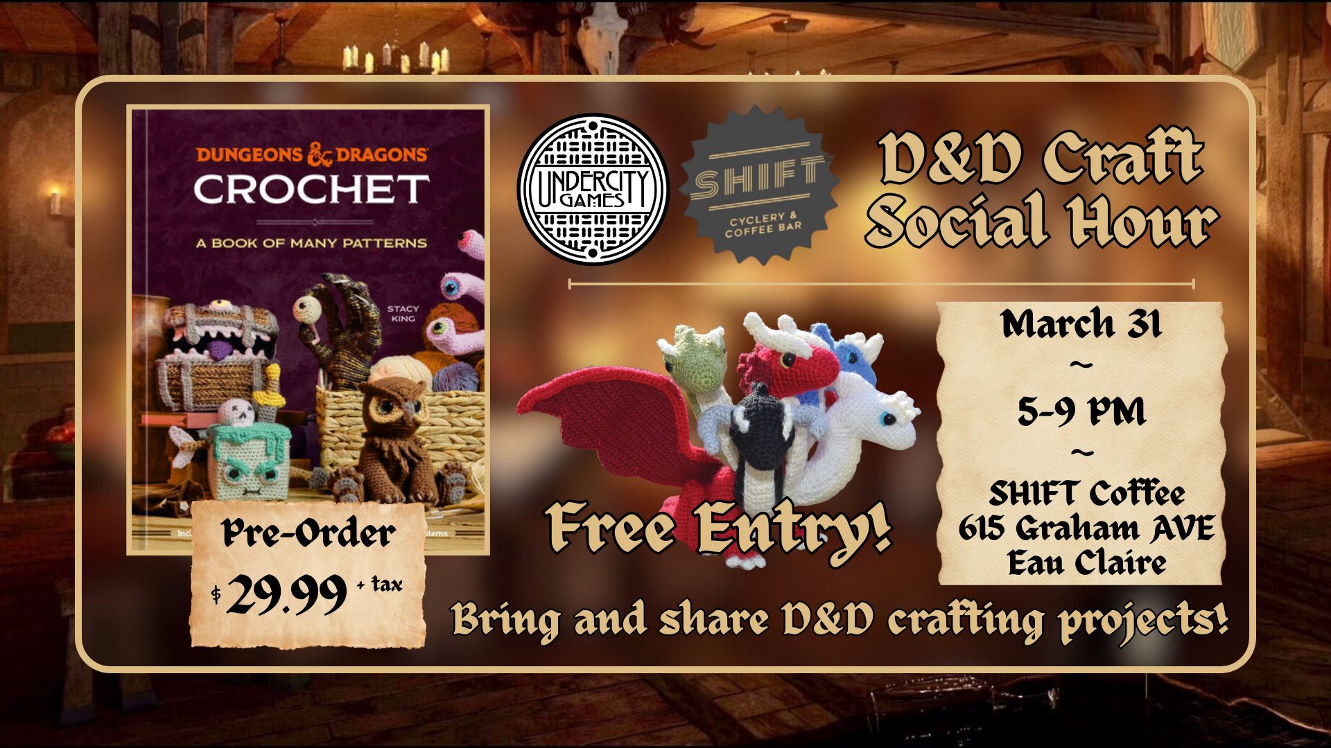 Join us as we celebrate the release of Dungeons & Dragons Crochet by Stacy King over at SHIFT Coffee Bar! Crochet Social Hour is open to all skill levels—fans are welcome to crochet, learn, or simply meet local crafters and share which school of magic they belong to. If you are not a fan of crochet, feel free to bring along any fantasy / D&D related crafting projects to share!